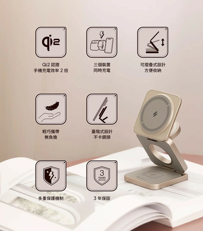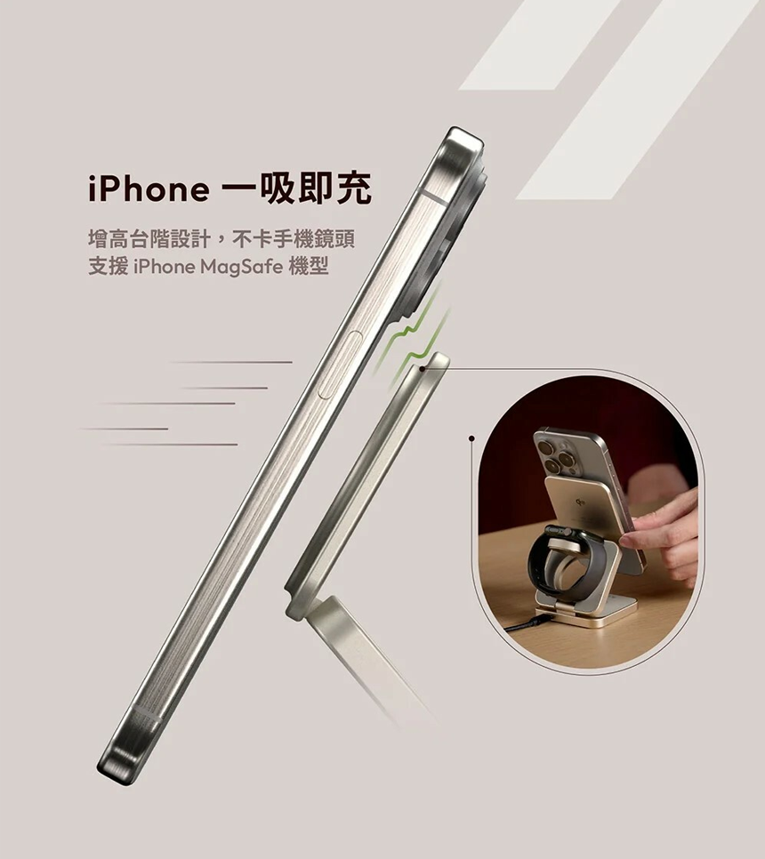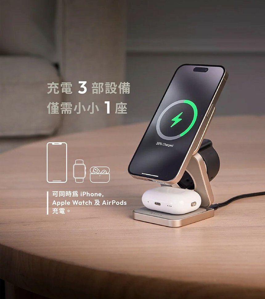 兼具時尚及功能性的三合一設計,同時為你的iPhone、Apple Watch提供快速充電,以及AirPods充飽電。