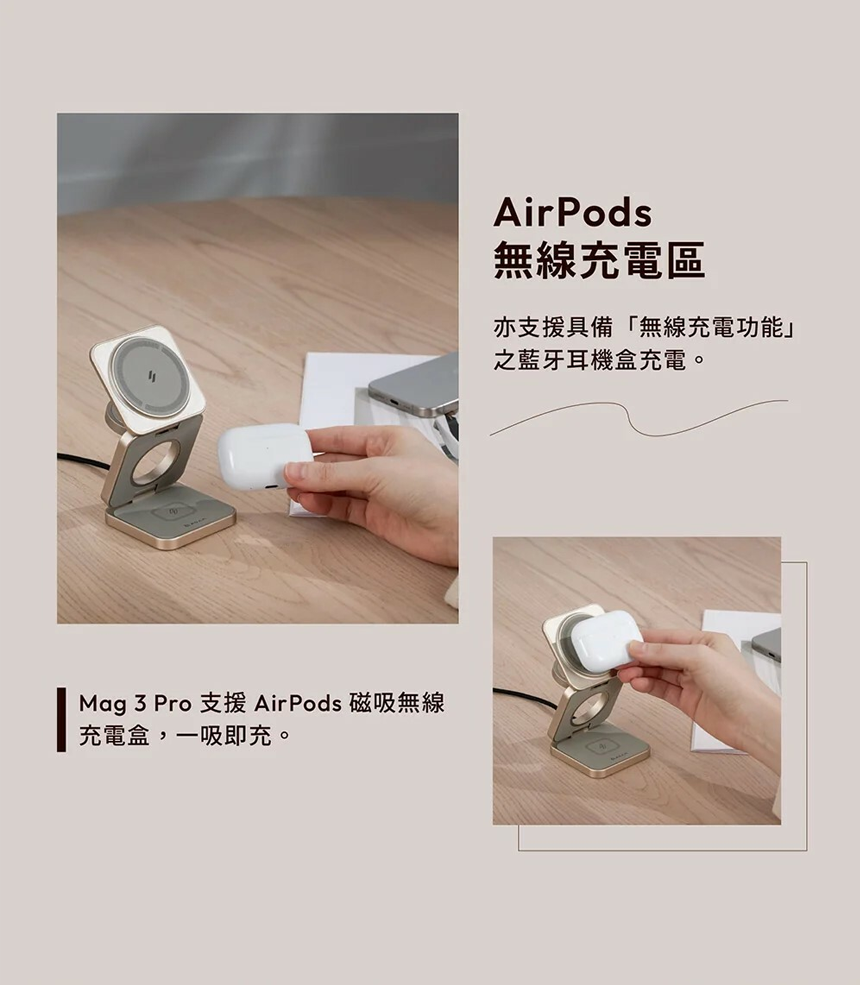 支援AirPods MagSafe磁吸充電盒,可選擇三種充電方式,自由搭配不受限。