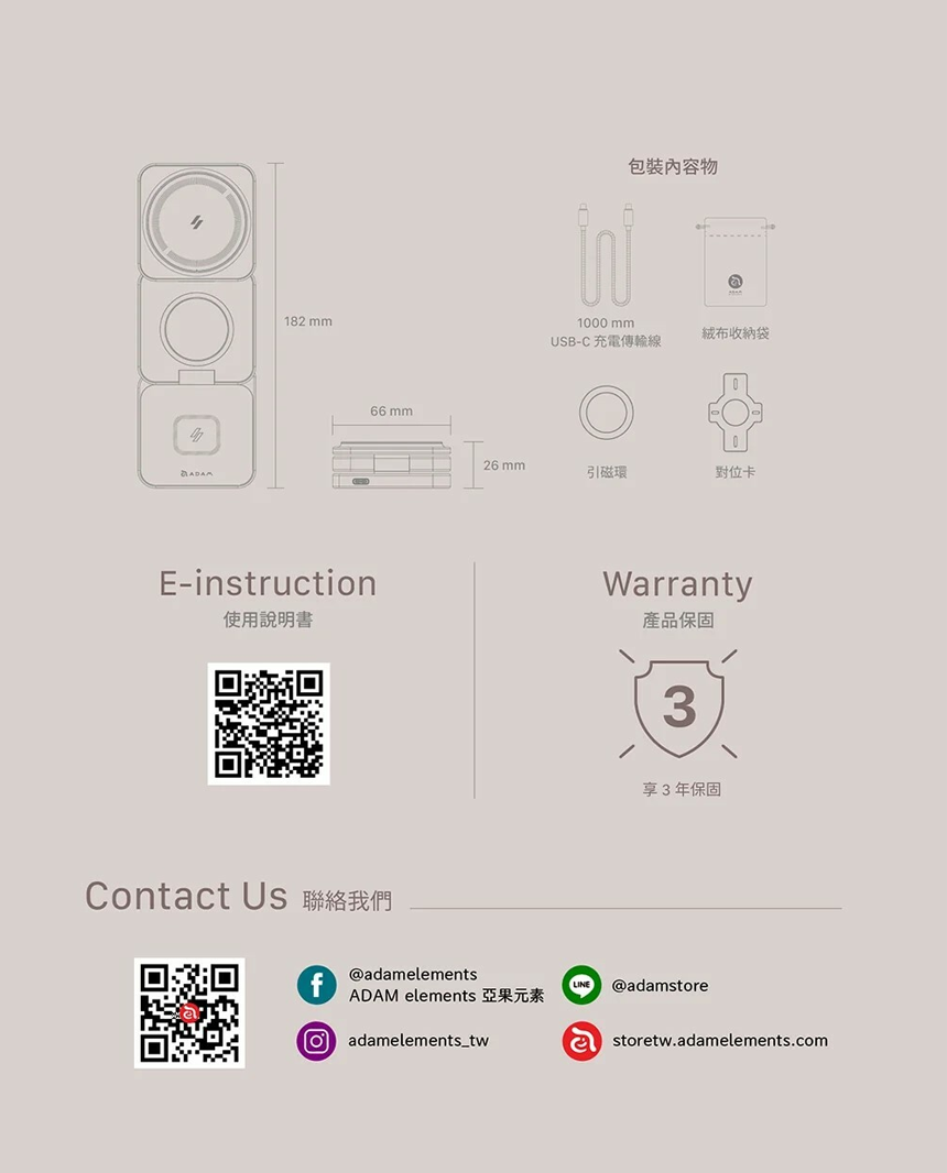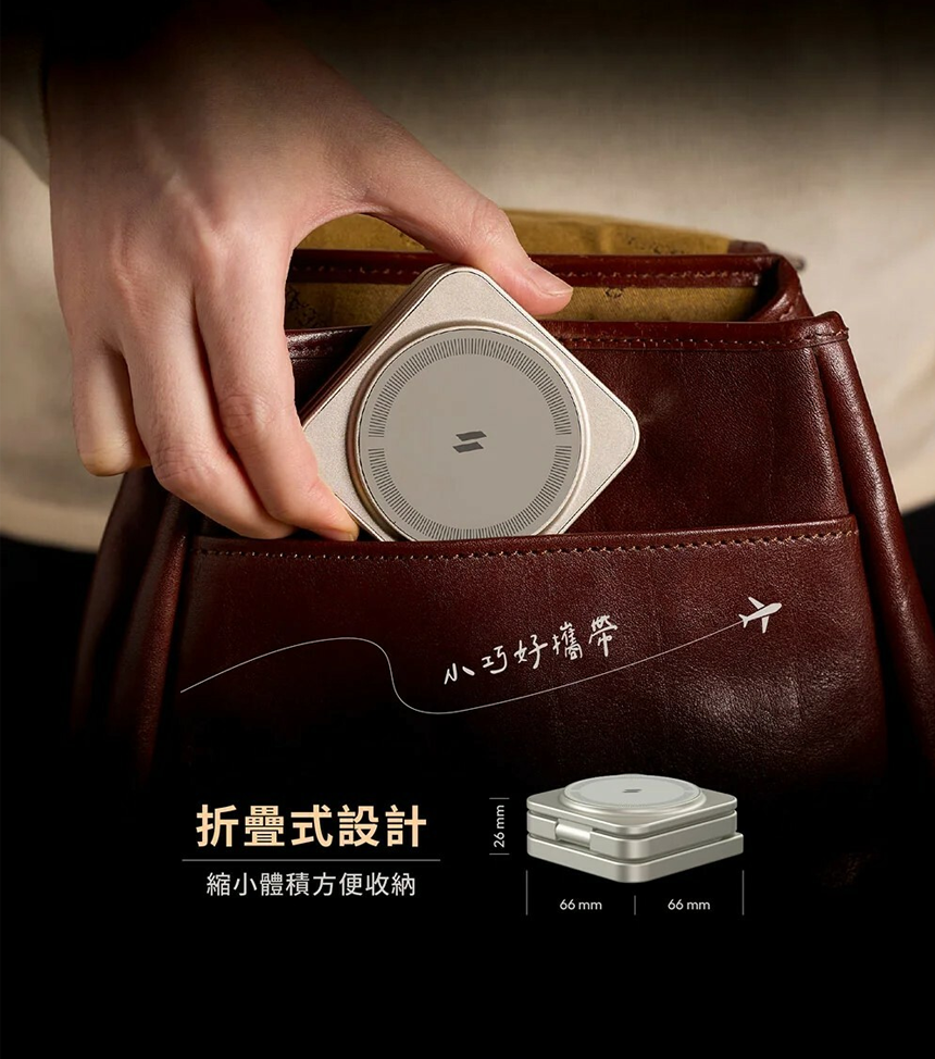 可折疊收納縮小體積,外出攜帶不佔空間,內附USB-C充電線,最大可達15W充電。