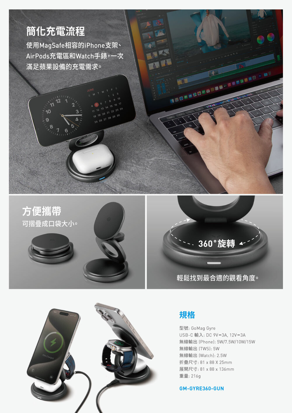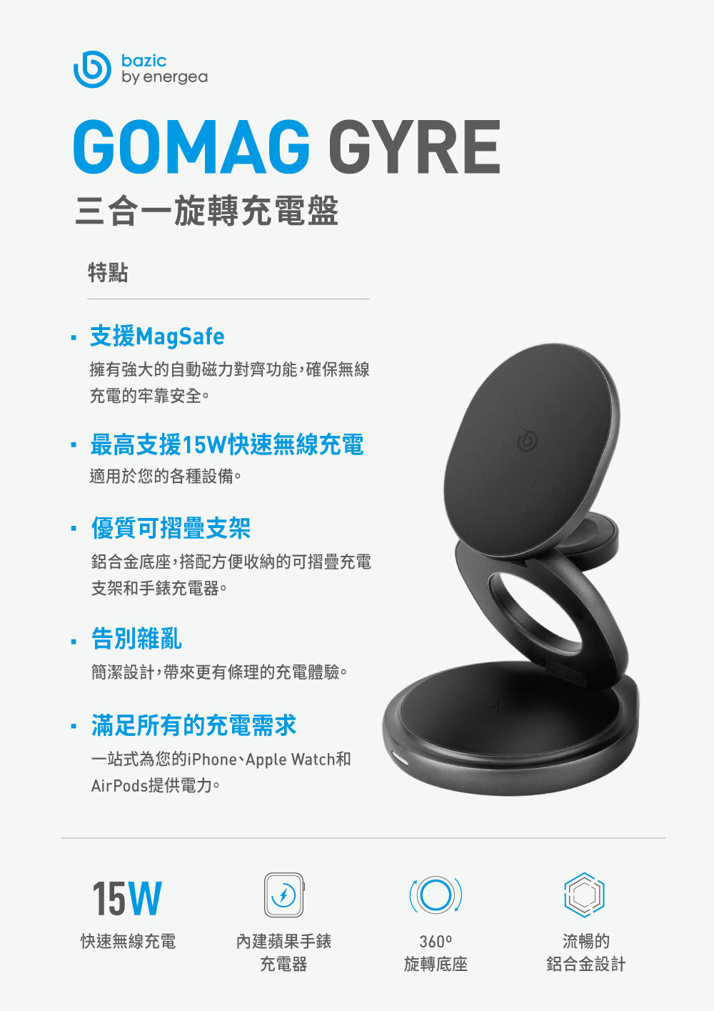 - 品牌:Bazic- 型號:GoMag Gyre- BSMI許可字號:R3D250- NCC許可字號:CCAH24LP0170T2- USB-C輸入:DC 9V⎓3A, 12V⎓3A- 無線輸出(手機):5W/7.5W/10W/15W- 無線輸出(手錶):2.5W- 無線輸出(TWS):5W- 折疊尺寸:81 × 88 × 25 mm- 展開尺寸:81 × 88 × 136 mm- 重量:216 g- 內容物:無線充電座、USB-C to USB-C 充電線(1m)、說明書、保固卡※ 顏色以實物為準![]()