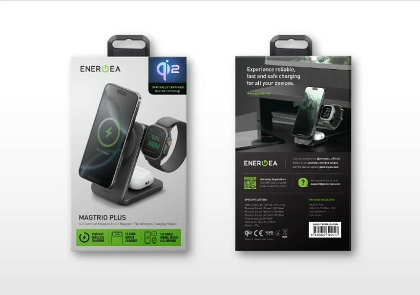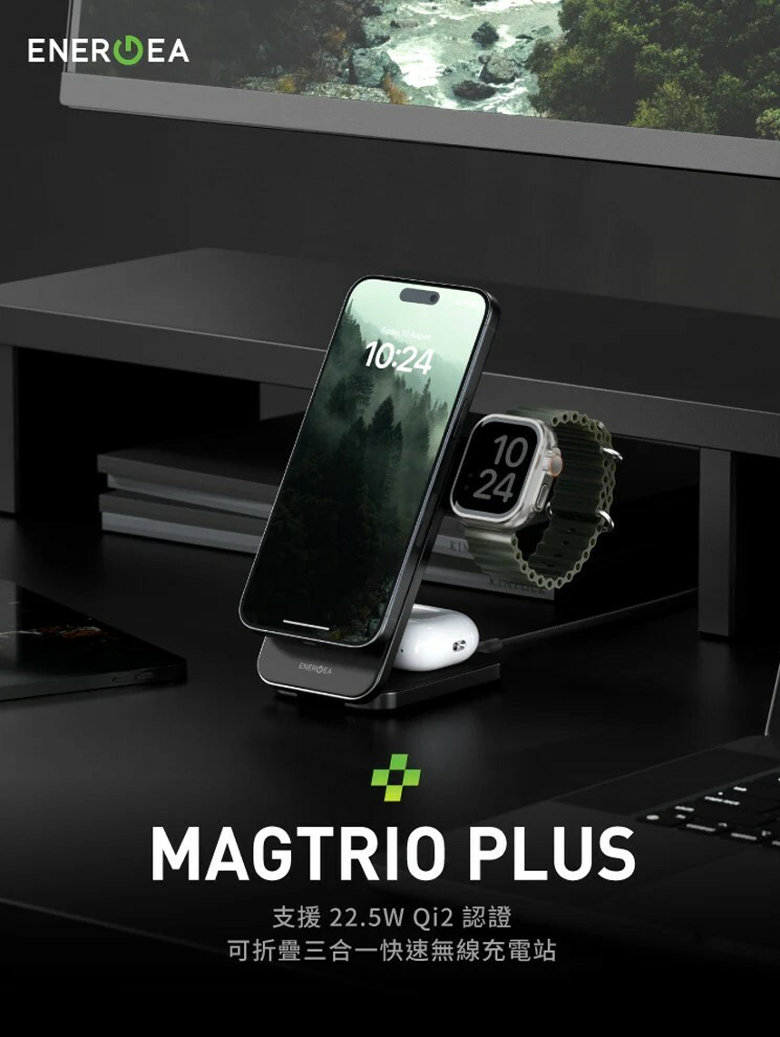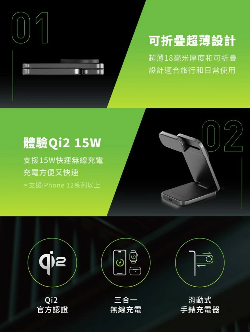 三合一無線充電站:手機、耳機、手錶多設備一次充滿電。