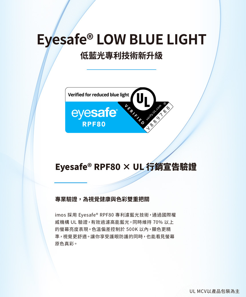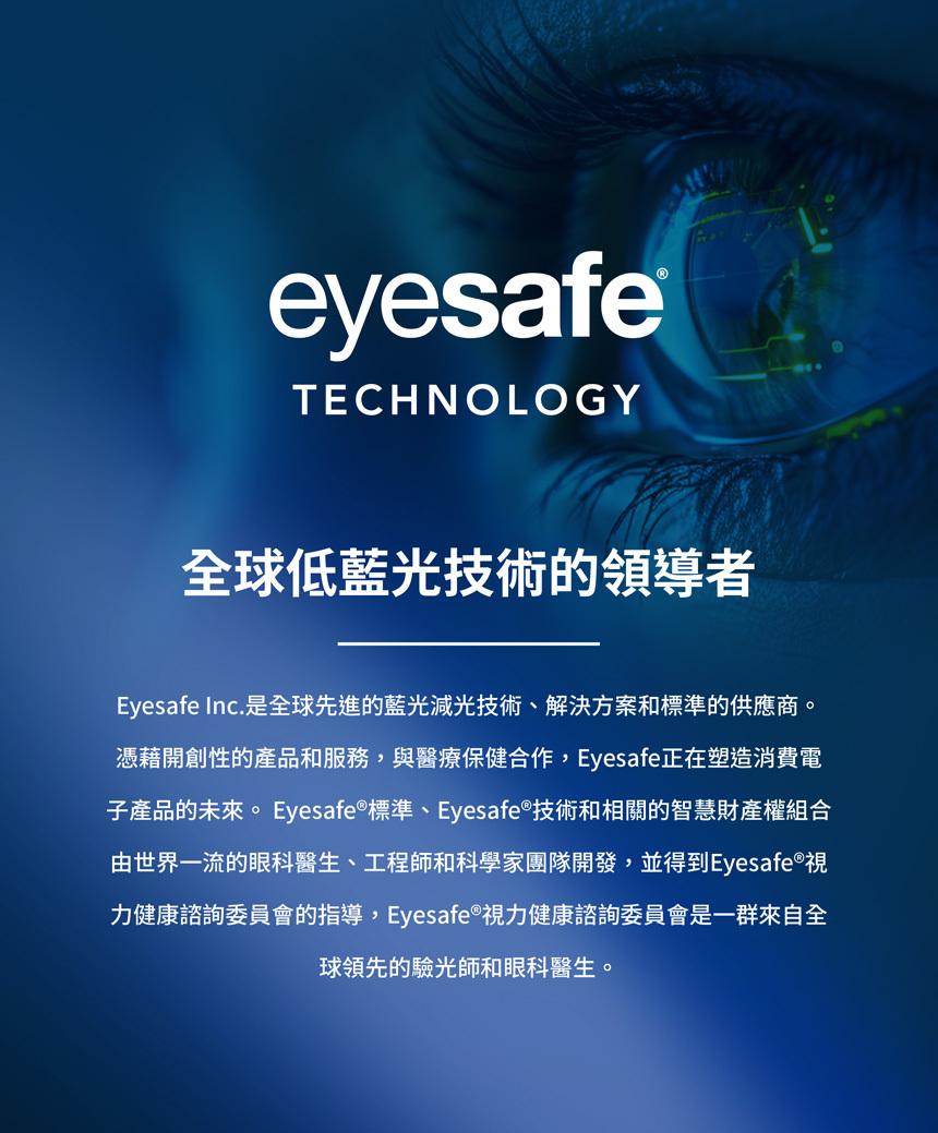 搭載 Eyesafe® RPF80 低藍光 與 Eyesafe® CPF60 晝夜節律防護低藍光,有效減少藍光干擾褪黑激素與睡眠,同時保持高透光與真實色彩。