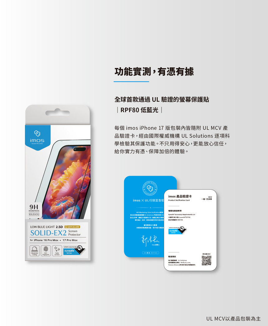🏆我們正式成為全球首家全面導入 UL Solutions「MCV 行銷宣告驗證」的 3C 配件旗艦品牌這意味著每一項產品特色,不再只是行銷口號,而是經由 UL Solutions 以科學方法與公正程序所驗證的具體成果。根據 UL Solutions 案例分享,imos 亦是全球第一個一次取得 12 項 MCV 驗證 的品牌,涵蓋光學性能 、防護能力 及健康影響 等面向,並以明確數據作為支持。這不僅是企業的重要里程碑 ,更是消費者選擇與信任的堅實保障 。