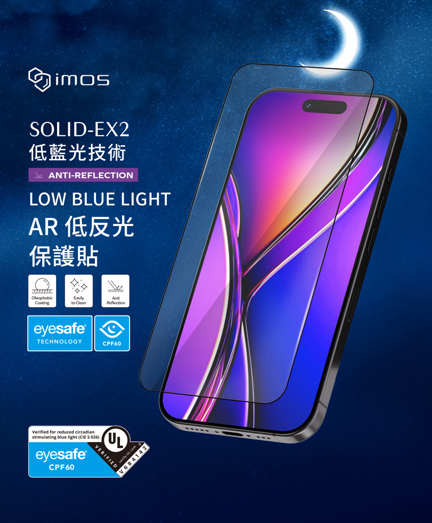 IMOS 美國UL Solutions 驗證 Eyesafe® CPF60 低藍光AR抗反光保護貼 iPhone17ProMax