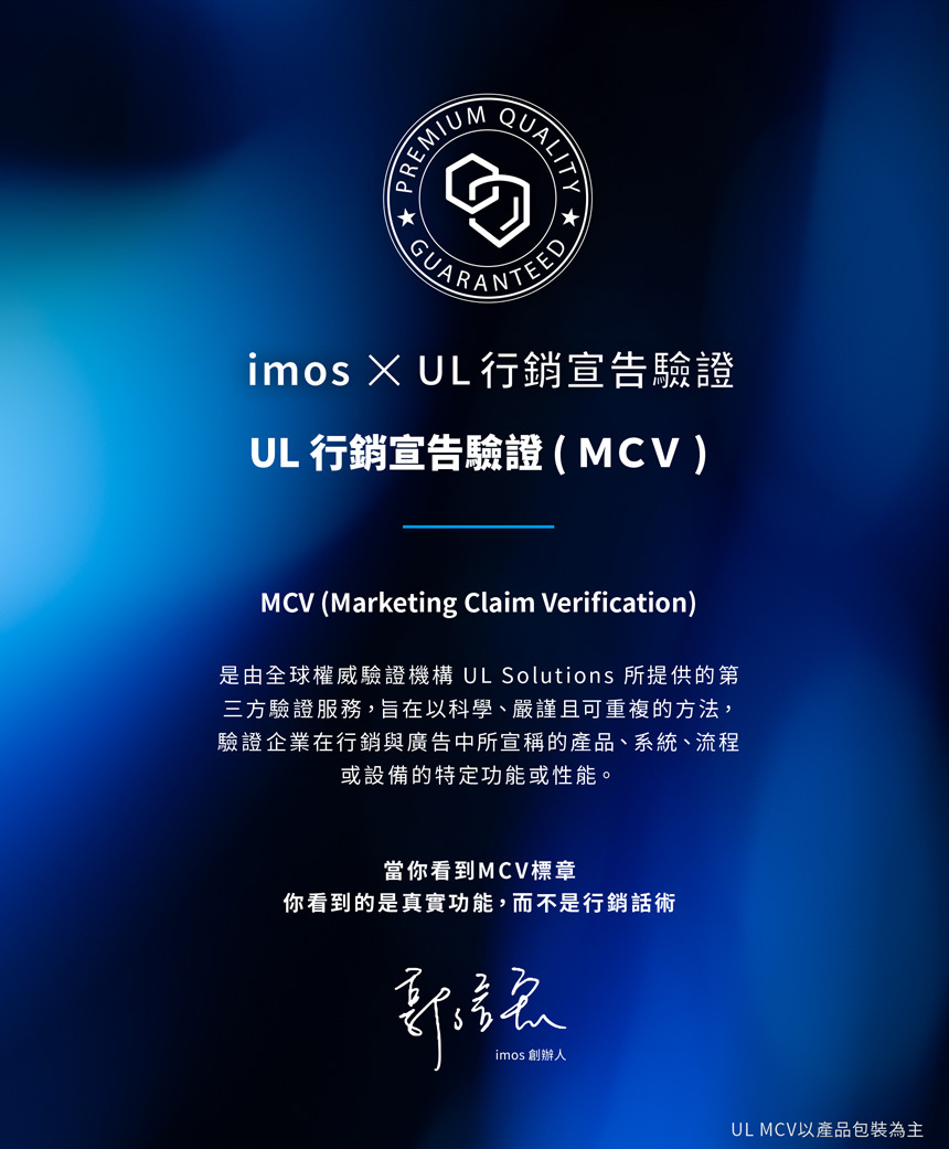 imos 與 UL Solutions 攜手,取得 12 項 UL MCV 行銷宣告驗證,以嚴謹科學數據,成為全球第一家全面導入 UL 驗證的 3C 配件品牌。
