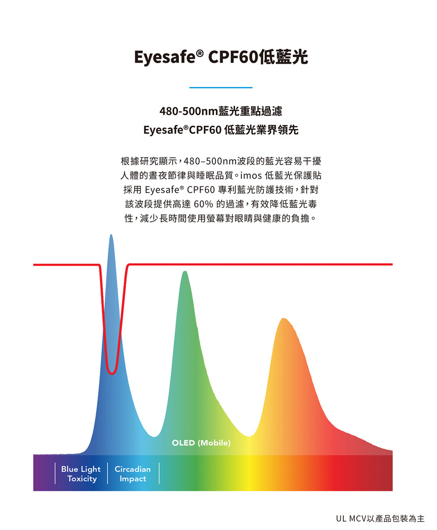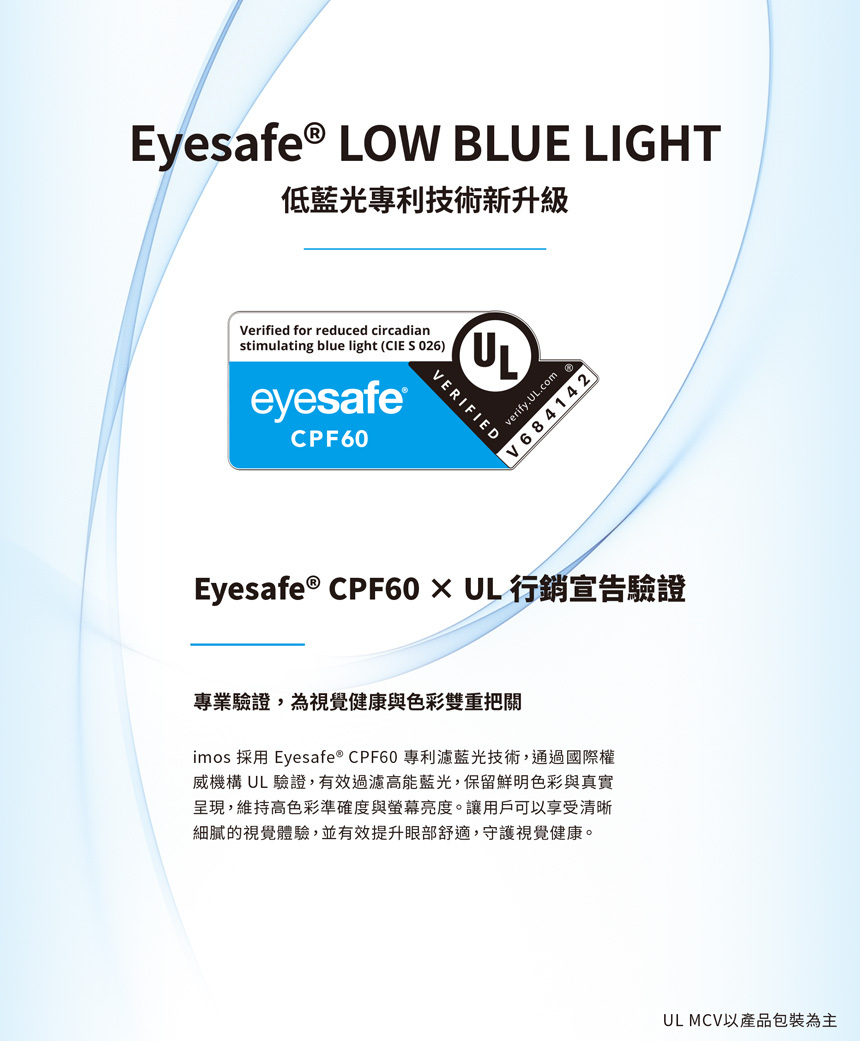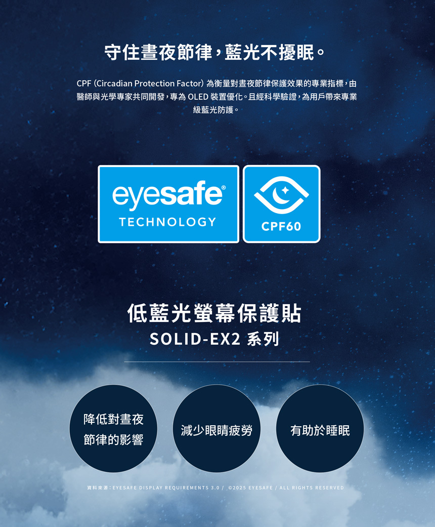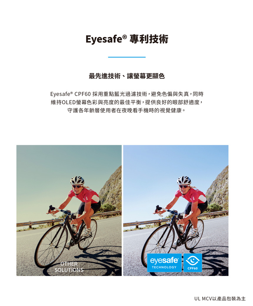搭載 Eyesafe® RPF80 低藍光 與 Eyesafe® CPF60 晝夜節律防護低藍光,有效減少藍光干擾褪黑激素與睡眠,同時保持高透光與真實色彩。