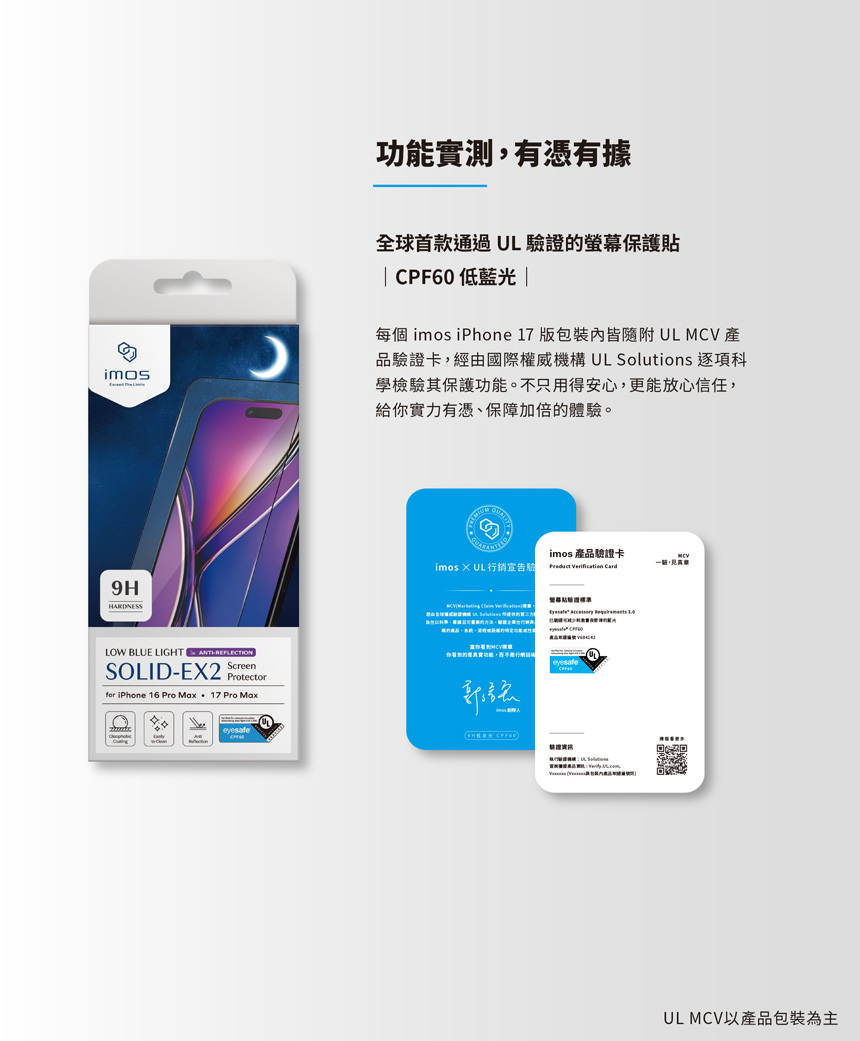 🏆我們正式成為全球首家全面導入 UL Solutions「MCV 行銷宣告驗證」的 3C 配件旗艦品牌這意味著每一項產品特色,不再只是行銷口號,而是經由 UL Solutions 以科學方法與公正程序所驗證的具體成果。根據 UL Solutions 案例分享,imos 亦是全球第一個一次取得 12 項 MCV 驗證 的品牌,涵蓋光學性能 、防護能力 及健康影響 等面向,並以明確數據作為支持。這不僅是企業的重要里程碑 ,更是消費者選擇與信任的堅實保障 。