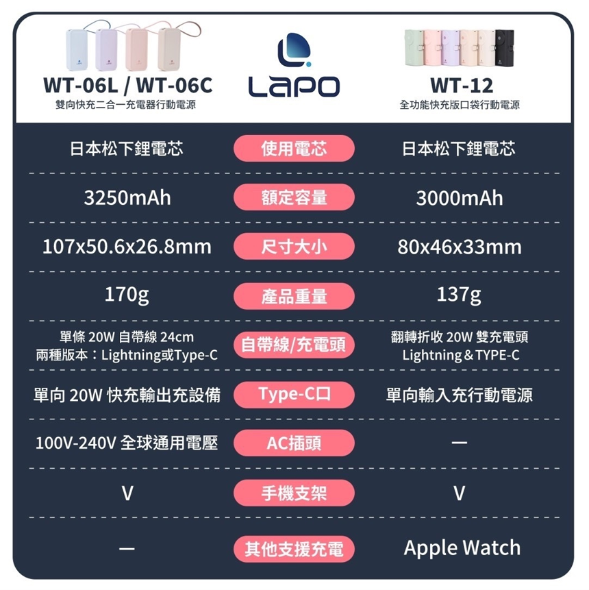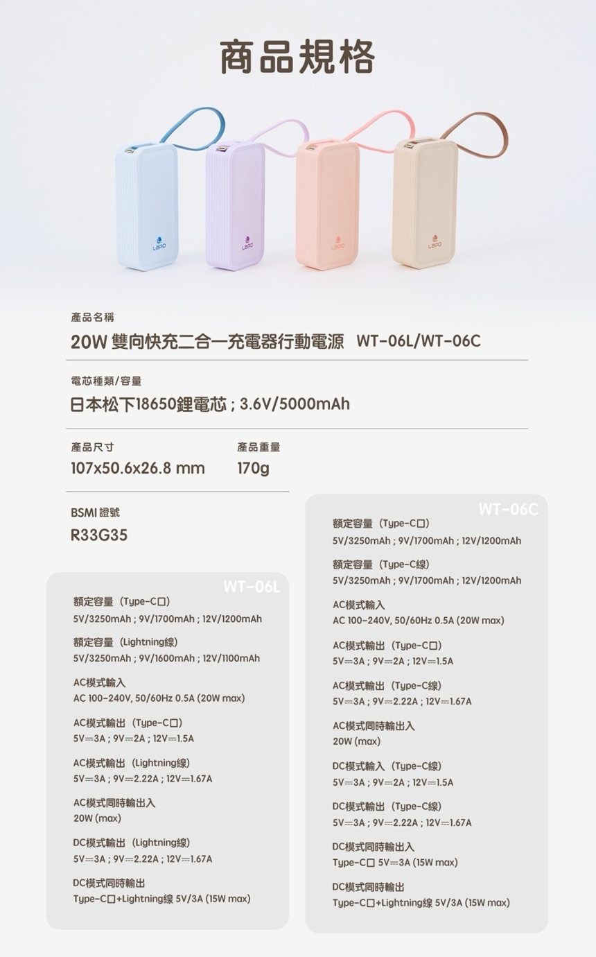 20W雙向快充二合一充電器行動電源WT-06L/WT06C