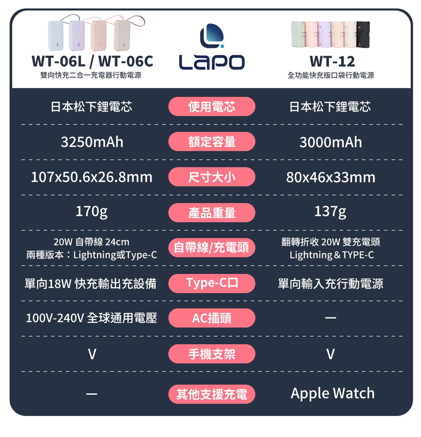 LaP多功能快充版口袋行動電源WT-12CL/WT-12TC