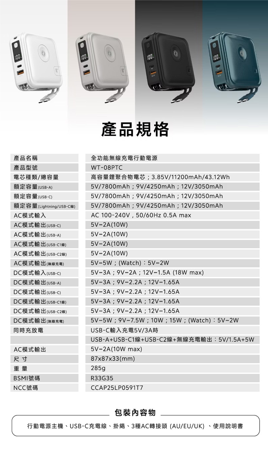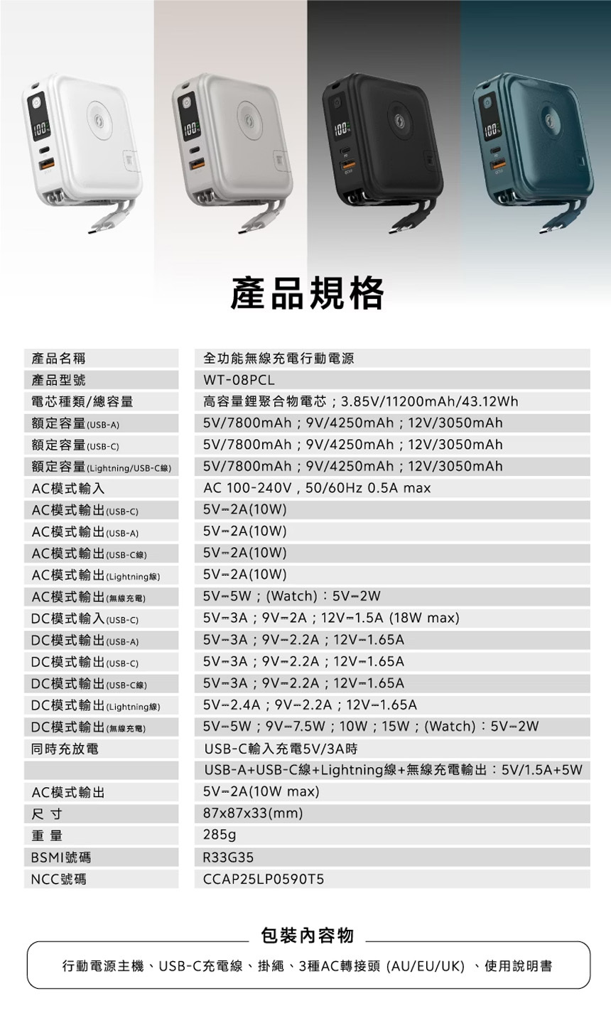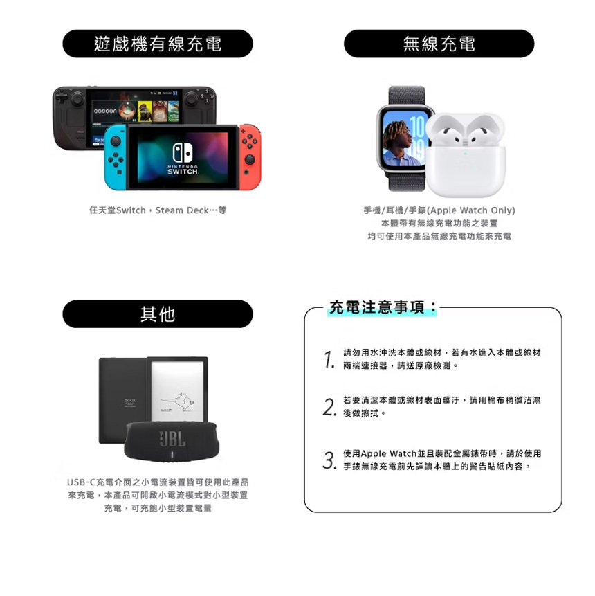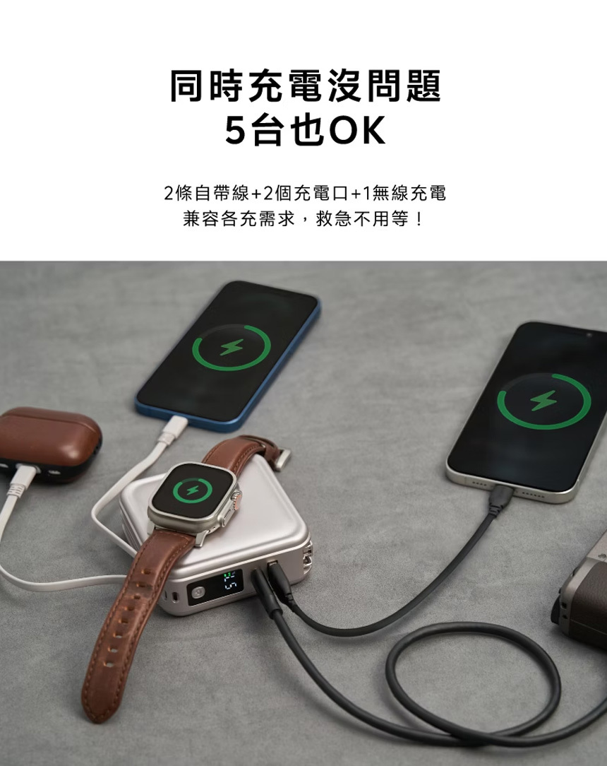 同時充放電:USB-A+USB-C線+Lightning線+無線充電輸出:5V/1.5A+5W