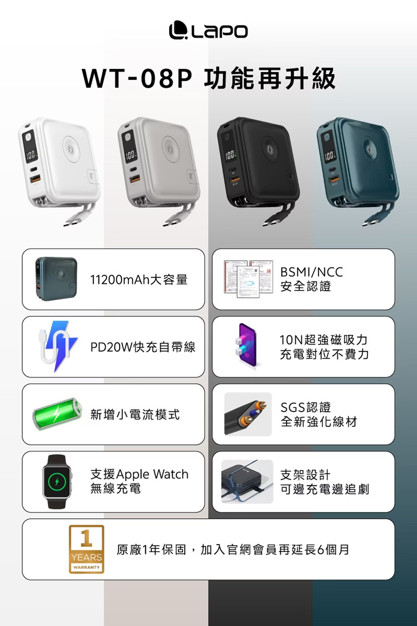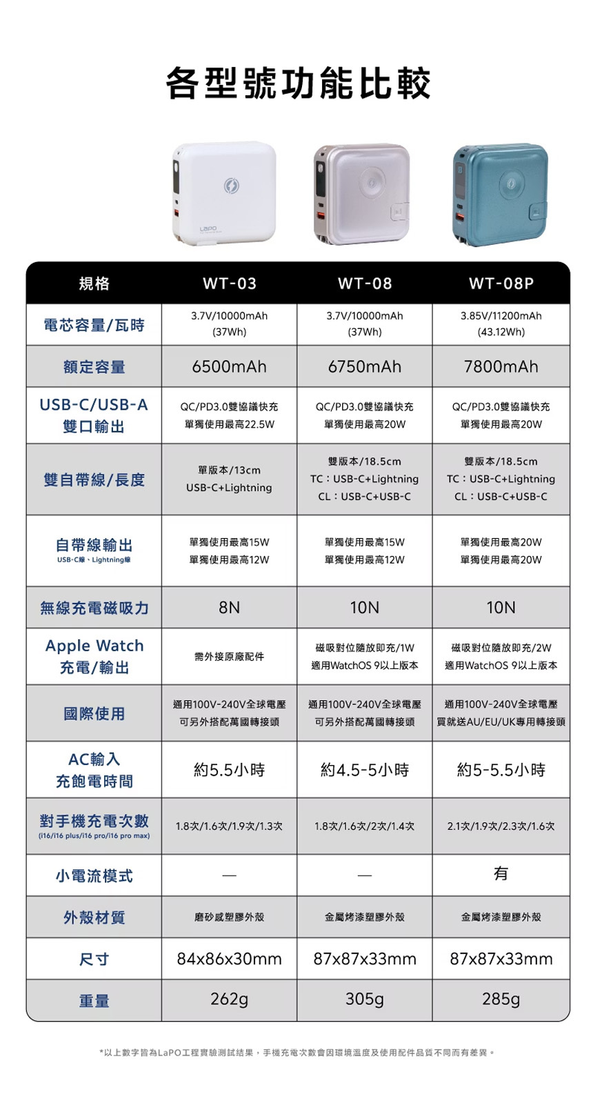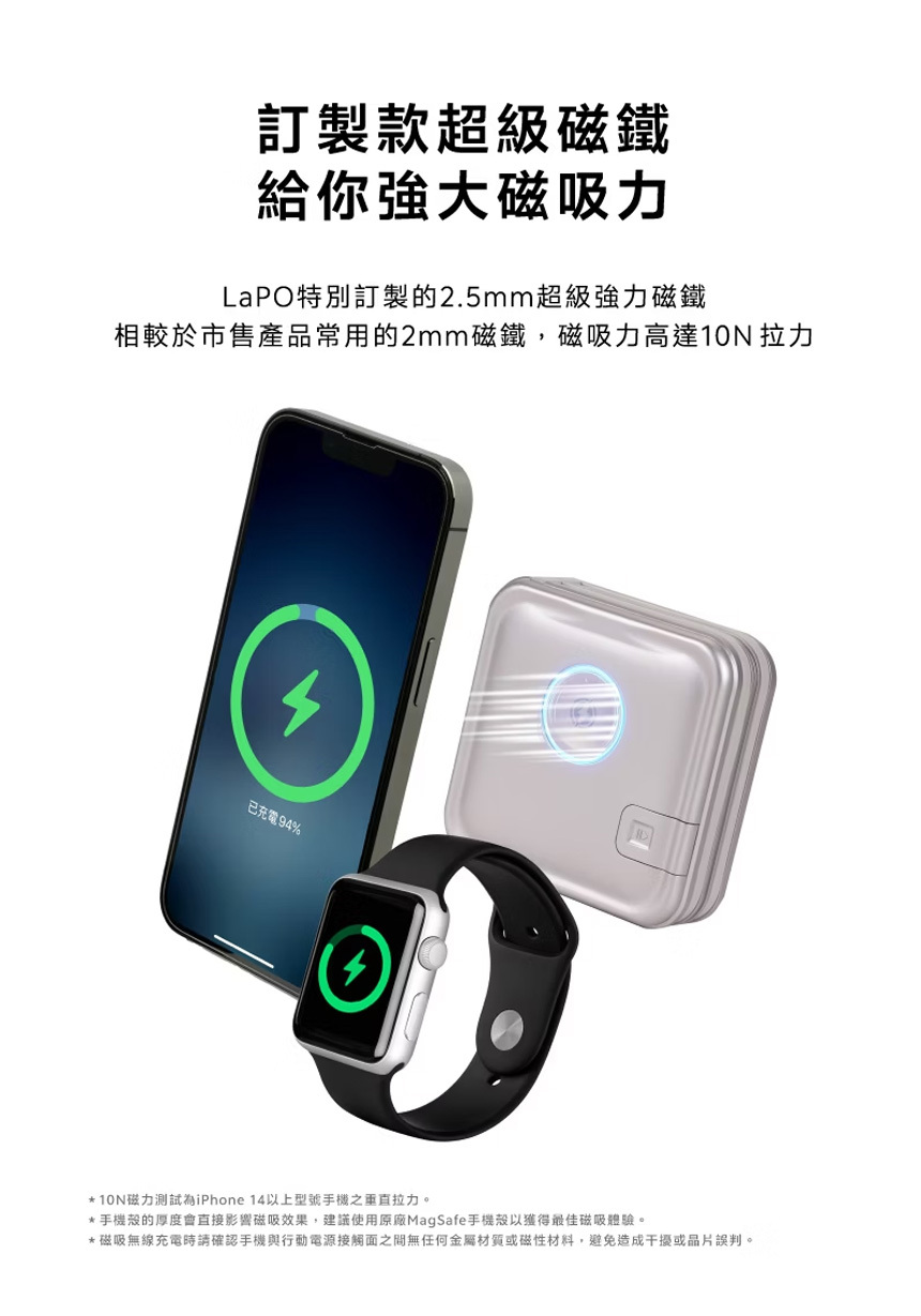 同時充放電:USB-A+USB-C線+Lightning線+無線充電輸出:5V/1.5A+5W