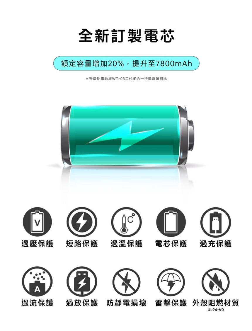 額定容量(Lightning/USB-C線):5V/7800mAh ; 9V/4250mAh ; 12V/3050mAh