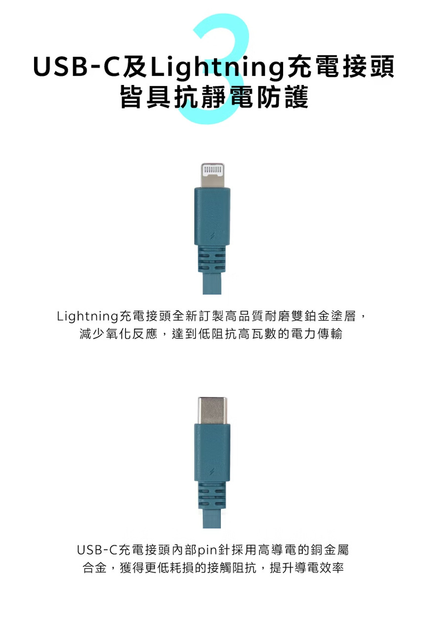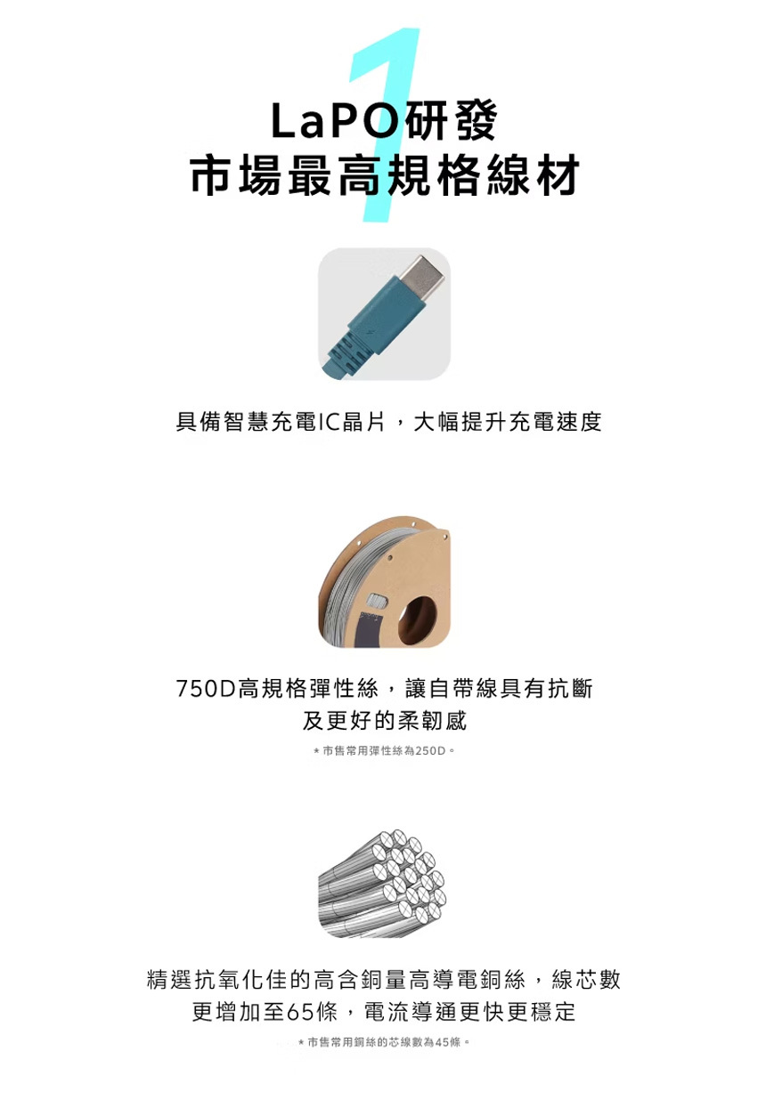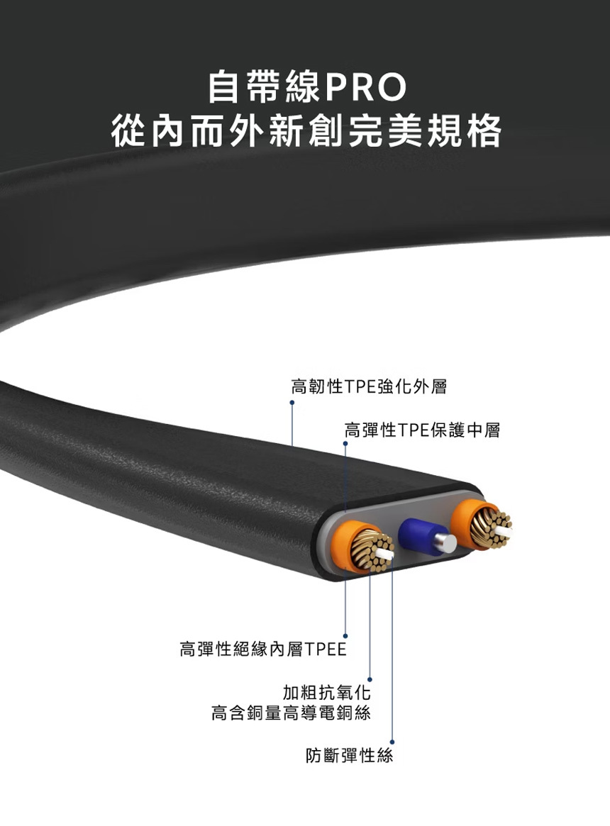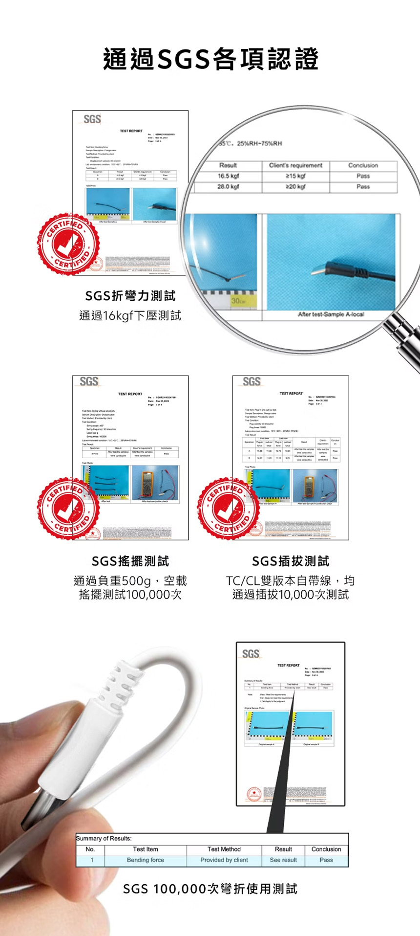 ・自帶線通過SGS 10萬次彎折/搖擺測試,為業界最高規格