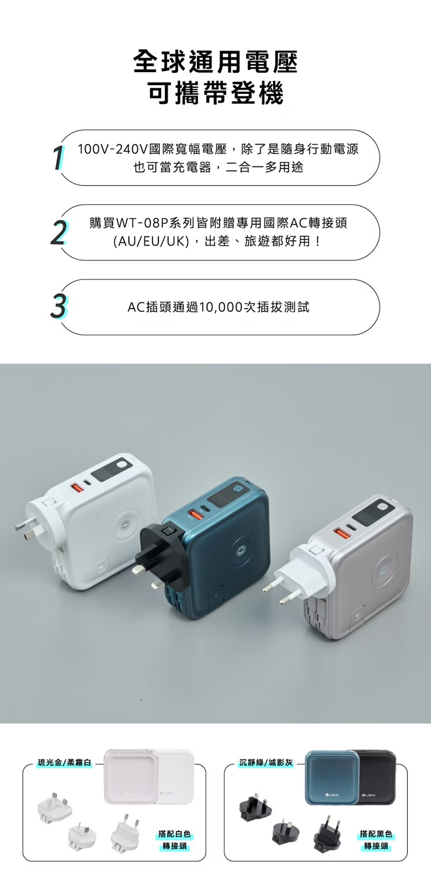 ・通用100V-240V全球電壓,可搭配附贈的附贈的轉接頭使用