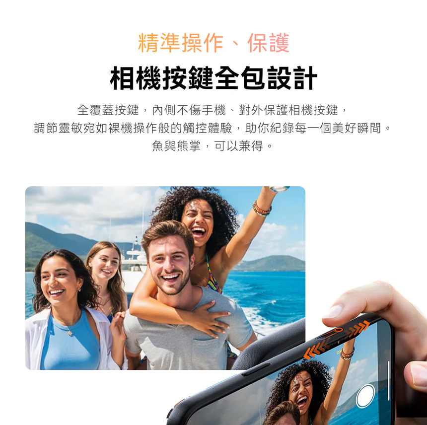 相機按鍵全包設計,按鍵內側不傷手機,還原靈敏觸控,紀錄美好瞬間