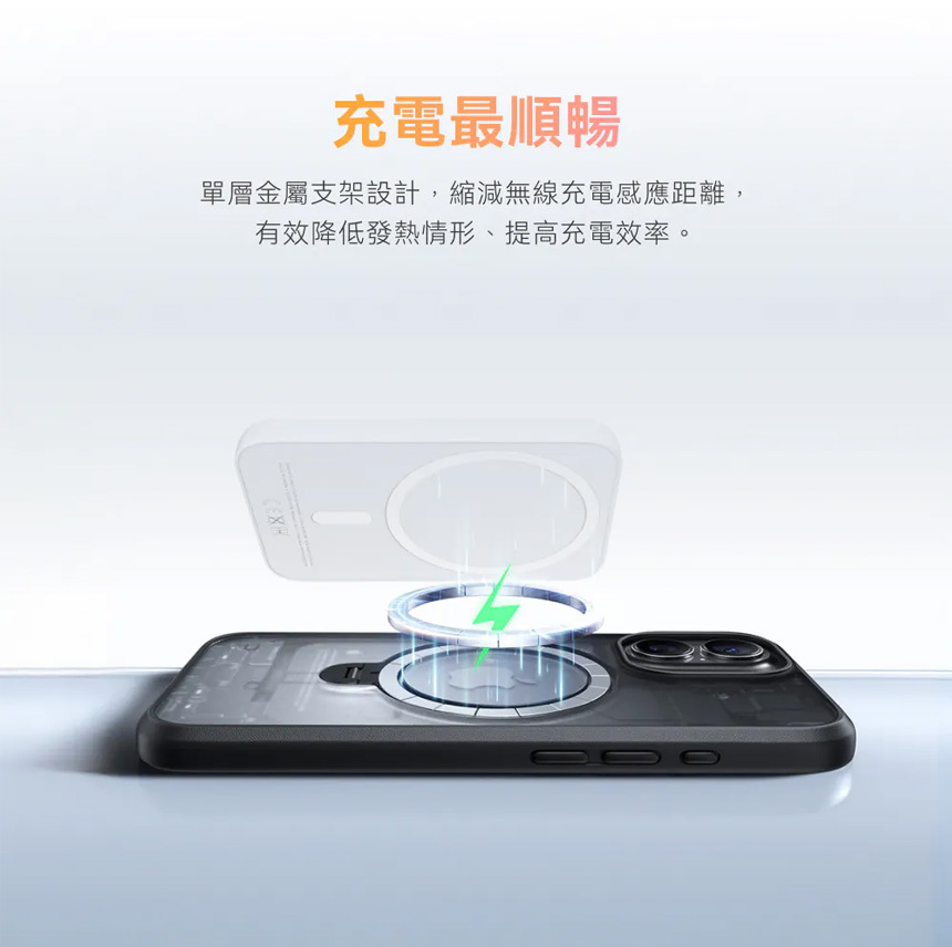 通過 30,000 次耐用測試,凹槽設計方便拿取,航太級O型鋁合金隱藏支架好收納,完美貼合手機背板不翹起